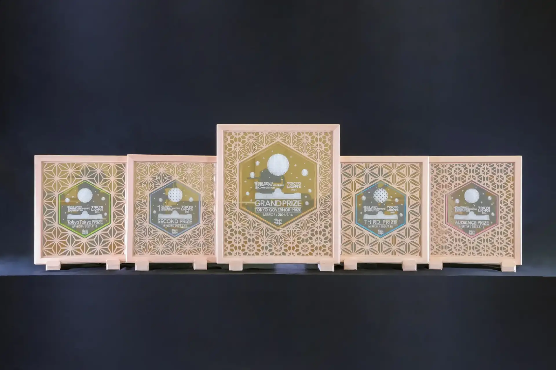 The 12th annual "1minute Projection Mapping Competition," Japan's premier and one of the world's largest international projection mapping contests, awarded its Grand Prix to Kentaro Tanaka (Japan). The award ceremony was held on Monday, September 16 (a national holiday) at the Seito Memorial Art Museum in Meiji Jingu Gaien. The presentation of the prestigious prize plate, crafted by combining two traditional Japanese craft techniques—Edo Kiriko glass and Kumiko woodwork—was conducted by Vice Governor Ushioda, 2024 Paris Olympics 48kg gold medalist Natsumi Tsunoda (SBC Shonan Beauty Clinic), breakdancer Shigekix (Dai-ichi Life), trampoline athlete Hikaru Mori (TOKIO Incarnami / Kanazawa Gakuin University Club).