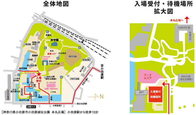 小田原城址公園に来られた際に、銅門広場にあるチケット受付で前売り券をご提示し、エリア入場券を受け取ってください。